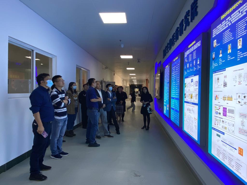 来访一行首先参观了参观学校生化分析检测公共服务平台、海洋生物医药研究院以及大规模细胞培养技术和细胞资源库公共平台。随后进行了座谈和交流。