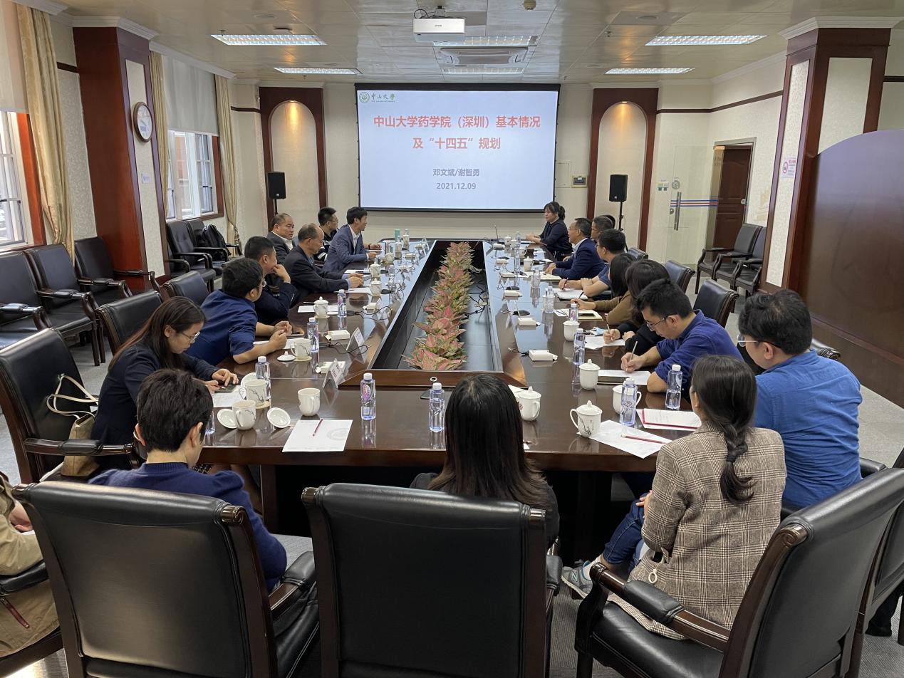 12月9日下午,中山大学药学院(深圳)院长邓文斌教授、杨德胜书记和副院长谢智勇教授及教师代表一行来太阳成集团122ccvip调研。学院党总支书记、院长刘冬,副书记段杰鑫,副院长李永红、黄略略热情接待了来访一行。