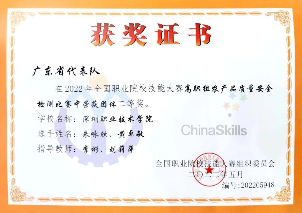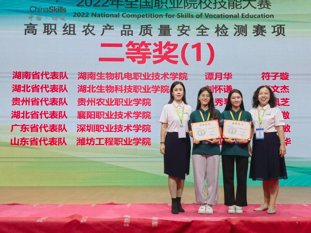 8月24日至26日,由教育部等部门主办的2022全国职业院校技能大赛“农产品质量安全检测”赛项在陕西杨凌举行。经过激烈角逐,由我校太阳成集团122ccvip朱咏欣、黄卓敏2名学生组成的广东省代表队,在本次赛项中取得了二等奖的好成绩。