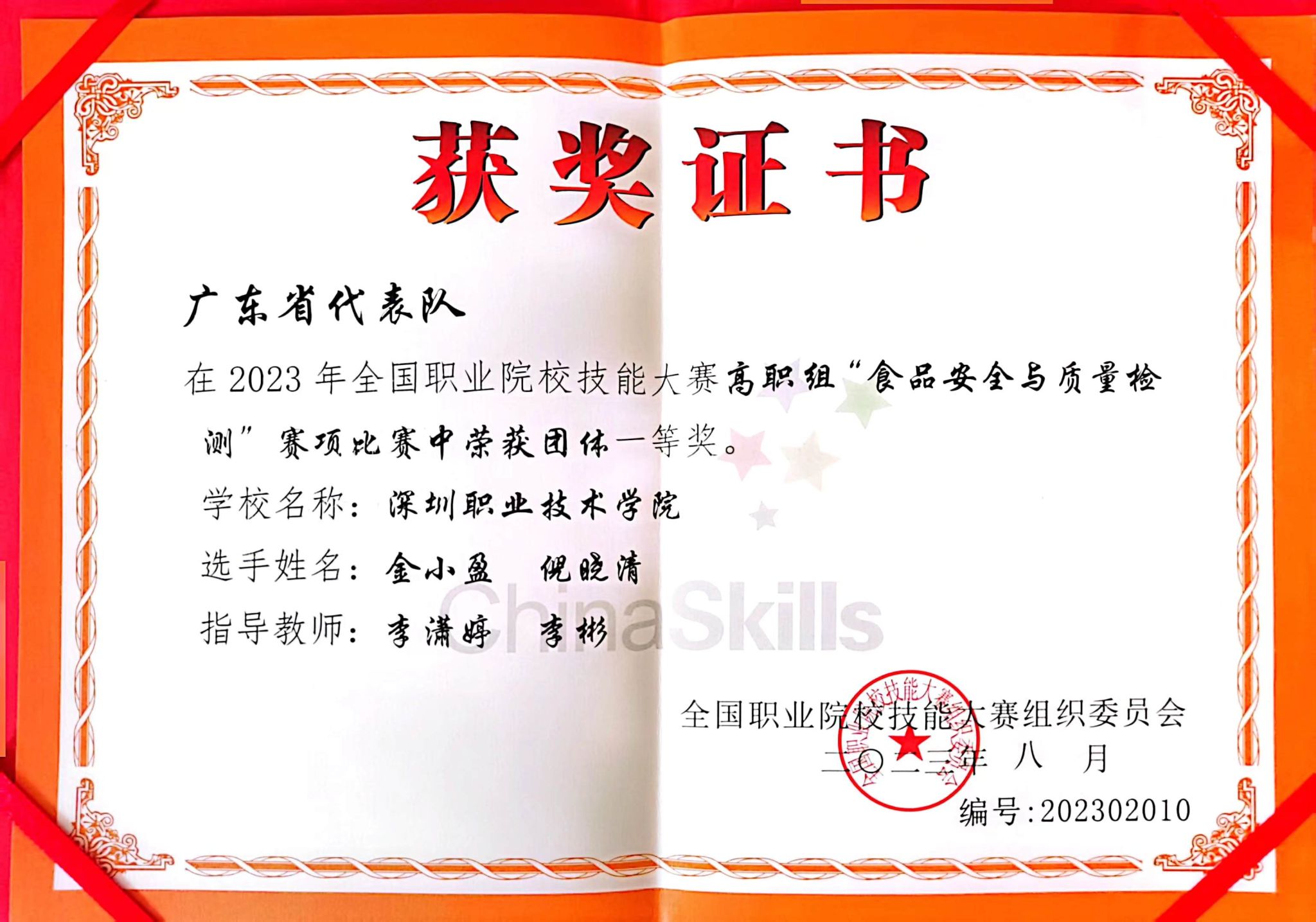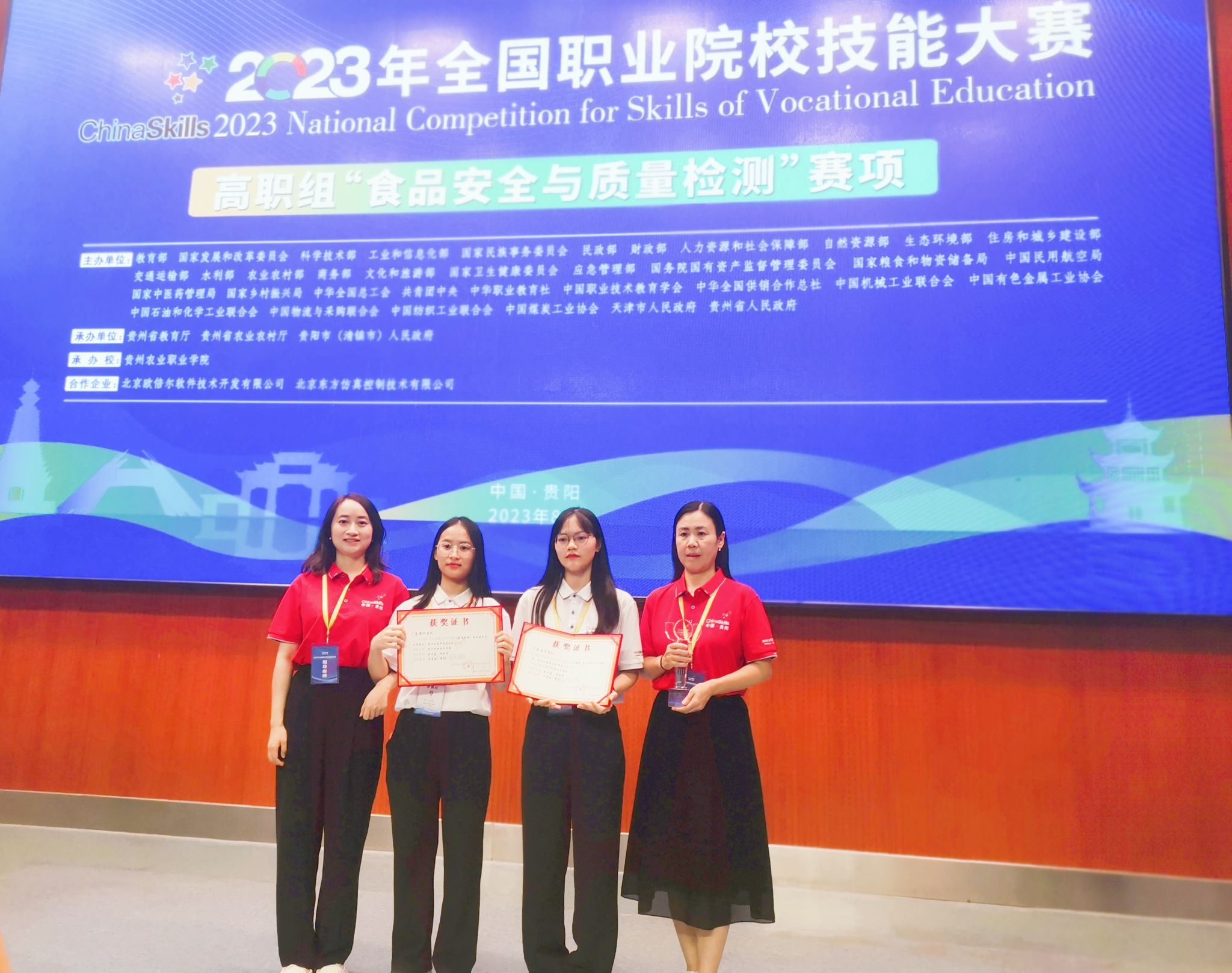 8月16日-20日,2023年全国职业院校技能大赛高职组“食品安全与质量检测”赛项在贵州农业职业学院举行,来自全国31个省(区、市)职业院校的60支队伍同台竞技。经过激励角逐,我校太阳成集团122ccvip李潇婷、李彬、沈丽老师指导的学生倪晓清和金小盈凭借扎实的专业知识、娴熟的技能,沉着应战,团结协作,一路破关斩将,最终获得赛项团体一等奖。