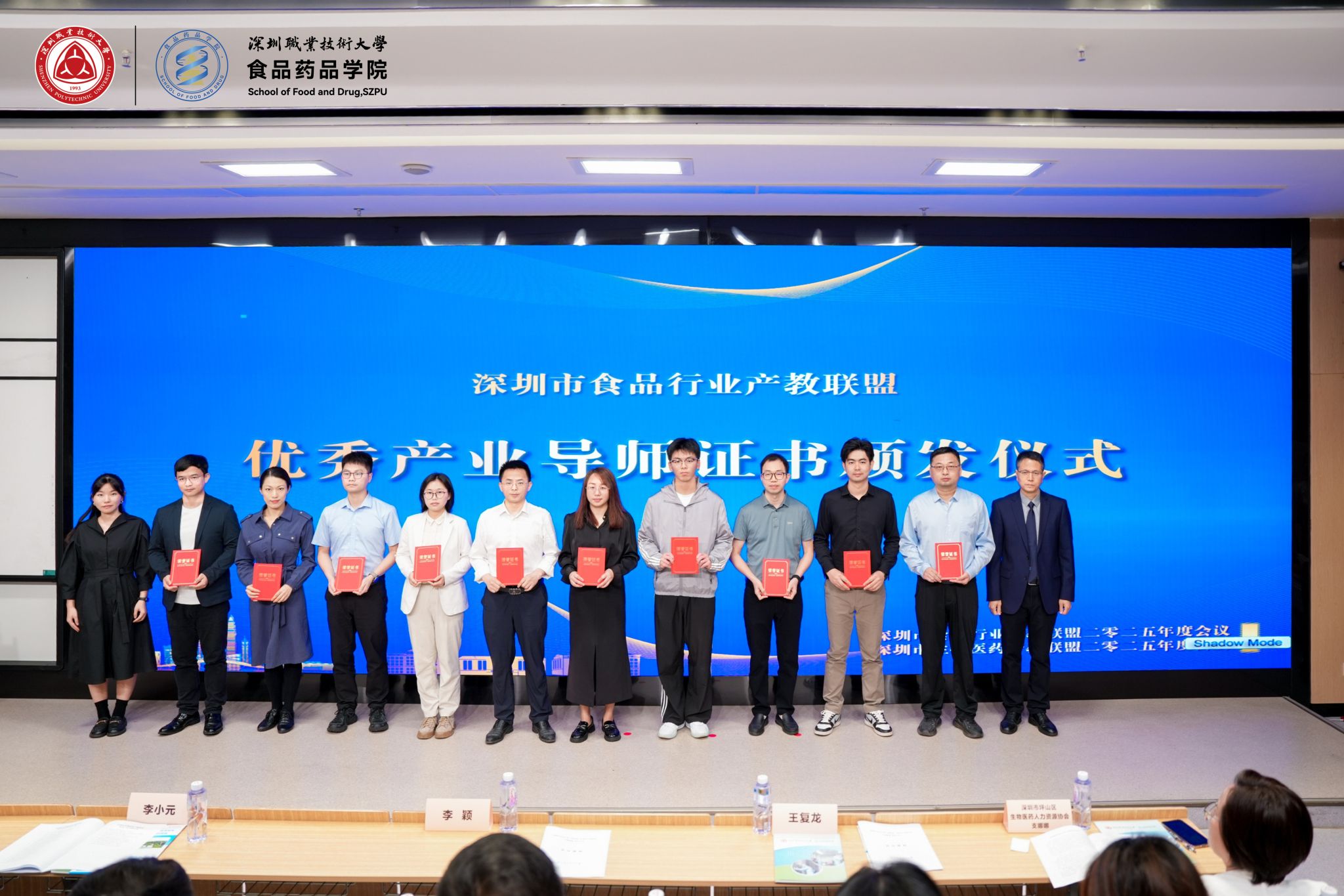 年会还举行了颁奖仪式,为两大联盟的优秀理事单位和优秀产业导师颁发证书,表彰他们在联盟发展、人才培养、技术创新等方面作出的突出贡献。深圳京柏医疗科技股份有限公司、深圳细胞谷生物医药有限公司等40家联盟成员获“优秀理事单位”称号,深圳易瑞生物技术股份有限公司王炳志、深圳市生物医药促进会张才万等20名产业导师获“优秀产业导师”证书,他们在联合课程开发、学生实训、就业指导等方面成效显著。同时,广东喜之郎集团等企业新晋联盟副理事长单位,辉瑞投资有限公司等43家企业成为新增理事单位,进一步壮大了产教协同“朋友圈”。