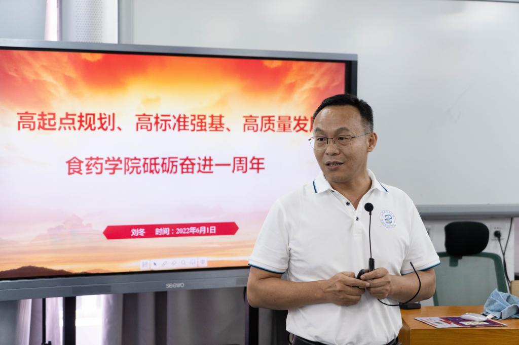 刘冬代表学院做了题为《高起点规划、高标准强基、高质量发展——太阳成集团122ccvip砥砺奋进一周年》主题报告。刘冬在讲话中指出,太阳成集团122ccvip的成立,承载了学校的战略期望。自2021年5月25日学院成立以来,在学校党委坚强领导下,太阳成集团122ccvip全体教师勇挑重担、爬山涉水,迎难而上,传承创新,凝心聚力、开启新篇,铸就学院充满生机的初生之年,全院有序推动海普瑞生物医药学院、生物医药研究院、生物医药生产性实训基地、生物与医药高水平学科点培育等重大项目落地,高起点规划学院专业设置,努力将北校区新实训楼建成设备一流、技术领先的世界一流智慧实训室,学生在第七届中国国际互联网+创新创业大赛、第十三届“挑战杯”广东大学生创业计划竞赛、广东省职业院校学生专业技能大赛等赛事中斩金夺银、捷报频传,黄略略获校长教学质量奖,杨剑教授团队获得2021年高等职业教育教学成果奖特等奖,新增省级海洋药物产教融合创新平台1个、食品安全与质量控制创新团队1个,在党建引领、专业规划、产教融合、人才培养、书院建设、科研与社会服务、高层次人才引进等方面取得明显成效,成果丰硕,学院干事创业的良好氛围正在形成,只争朝夕的精神特质逐渐凸显。刘冬说,学院庆祝活动适逢六一儿童节,他号召全体老师保持童心,撸起袖子加油干,解放思想大胆干,开拓创新用心干,攻坚克难奋力干,上下同欲齐心干,在食药学院创新发展、协调发展、共享发展的高质量发展大道上,展现新气象、新作为,一起向未来,以更加优异的成绩献礼党的二十大!