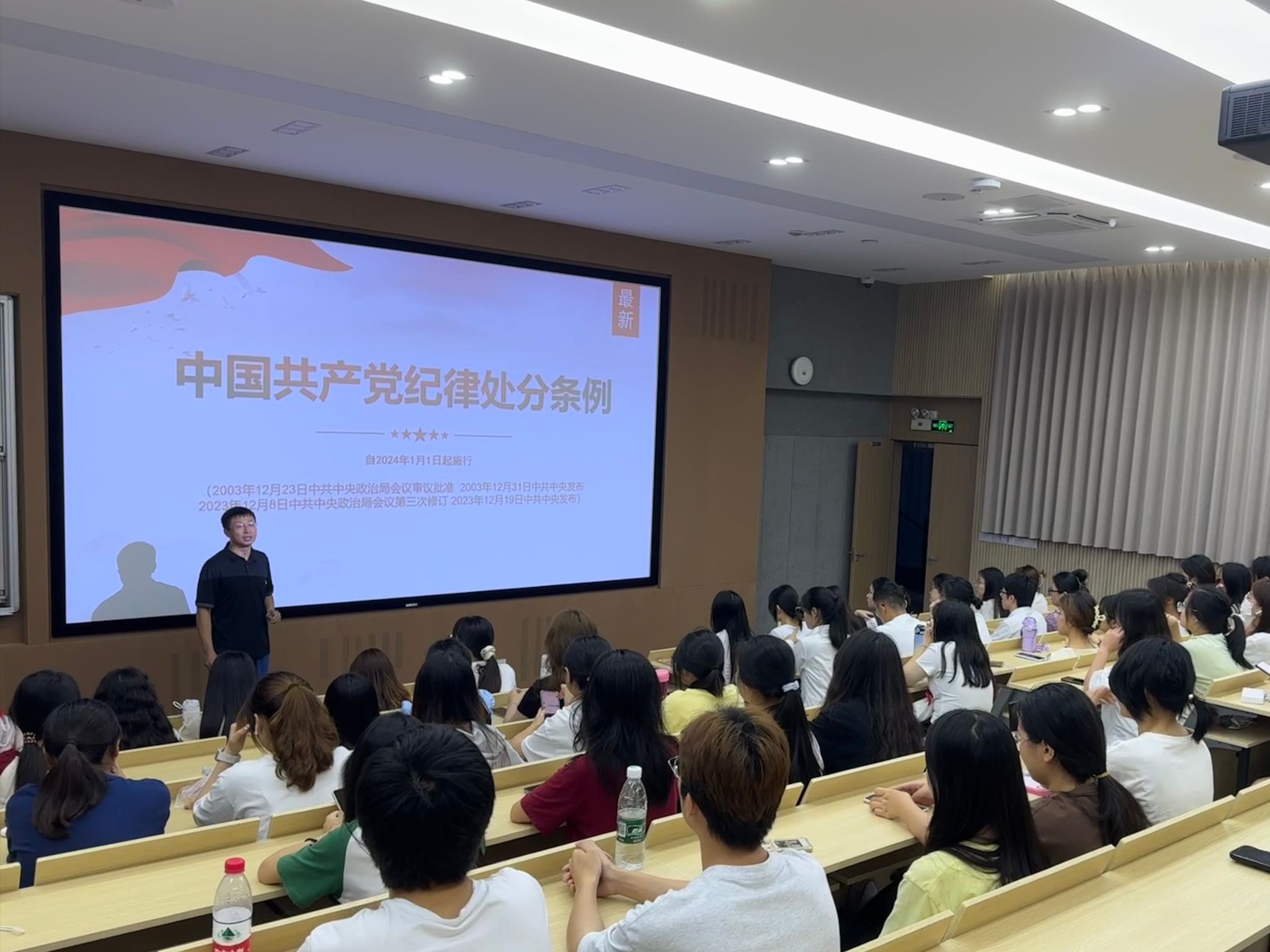 课上,段杰鑫领学了习近平总书记关于严明党的纪律系列重要论述,并就新修订的《中国共产党纪律处分条例》展开详细介绍和深入解读。他指出,党的十八大以来,我们党先后于2015年、2018年、2023年3次修订《条例》,就是要始终坚持严的基调,全面加强党的纪律建设。段杰鑫对《条例》各个章节的增写内容和修订内容作出了深入浅出的解读,并通过具体案例,生动展示了违纪行为的严重后果,警示在场的学生党员和入党积极分子要时刻绷紧纪律这根弦。最后,他要求同学们自觉主动学、原原本本学、逐章逐条学、持续深入学,深刻理解学习党纪的重要性和必要性,在日常生活中加强自我约束,做到言行一致,以身作则,为身边的同学树立榜样。本次活动让同学们对新修订的《中国共产党纪律处分条例》有了更深入的认识,进一步增强了学生党员的纪律意识和规矩意识。(食药学院 康清越)