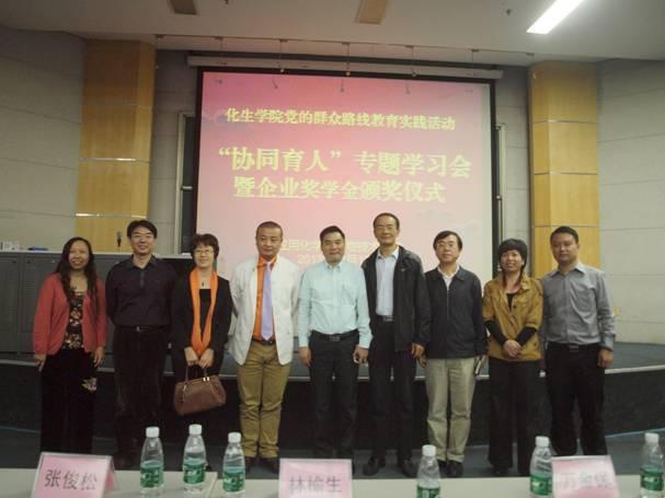 11月13日下午,化生学院党的群众路线教育实践活动协同育人专题学习会暨企业奖学金颁奖仪式在留仙洞校区学思楼306召开。学校副校长万金保、科研处副处长阮艺华、产学研用促进处副处长胡延华、化生学院全体院领导、深圳市福荫食品集团有限公司董事长、深圳市食品科技学会会长林榆生、深圳市生命力生物保健科技有限公司厂长张党军、深圳市食品科技学会秘书长张永红等出席会议,化生学院全体教职工及部分学生代表参加了专题学习活动。会议由化生学院分党委副书记黄川川主持。